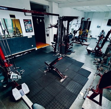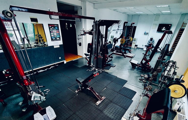 Spațiu echipat pentru antrenamente complete, de la tonifiere la creșterea masei musculare.